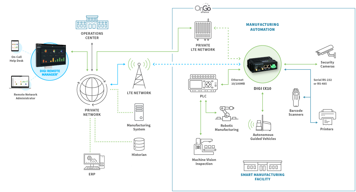 Digi IX10 can operate on public and private LTE networks, with features to assist in network control and management, such as dual SIMs for failover connectivity, VLAN support, load balancing between cellular and Ethernet WANs, dual APNs and configurable APN search. Digi IX10 also supports the optional 2FF Digi eSIM accessory, enabling remote carrier switching, zero-touch activation and enhanced WAN flexibility.