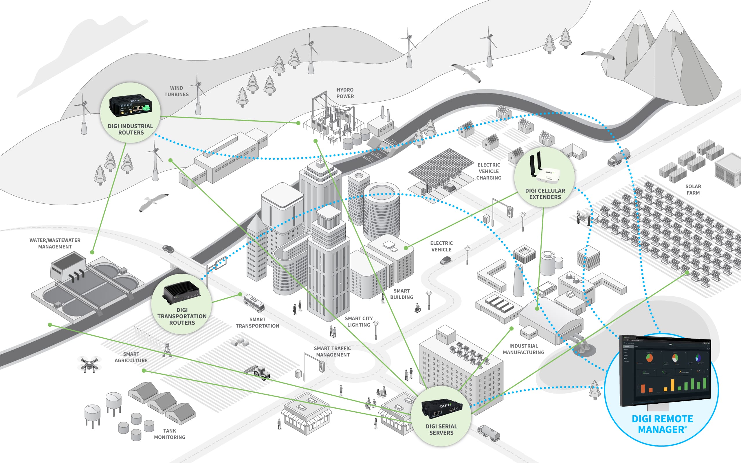At its core, Green Tech is driven by wireless communications. Solar panels, precision agriculture applications and smart city systems like street lighting and wastewater management systems all require connectivity – for monitoring, management, automation and data insights. Electric vehicles connect to find charging stations. Environmental monitoring systems require connectivity to monitor industrial tank levels and check for water leaks and chemical emissions. Behind it all, Digi wireless connectivity and cellular solutions enable fast, reliable and secure communications and data routing.